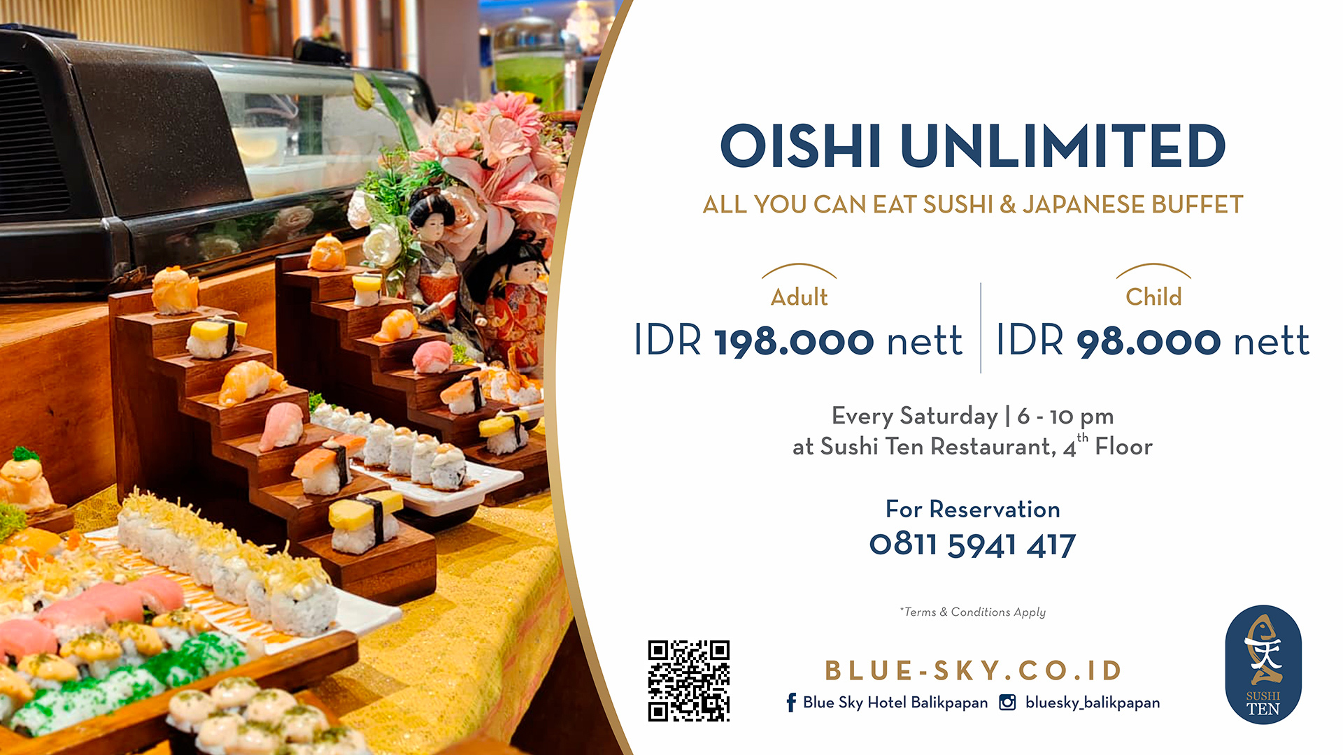 Blue Sky Hotel Balikpapan has three restaurants: Garden Restaurant • Sushi Ten(Japanese Restaurant) • Golden Palace (Chinese Restaurant)All restaurants also offer a modern, warm, and elegant contemporary design with the best views in the city.